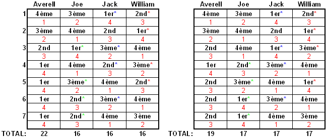 Ici, Joe, Jack et William termine avec 16 points, et Joe est devant Jack 4 fois (courses 1, 3, 4, 6), Jack devant William (courses 1, 2, 5, 7) et William devant Joe (courses 2, 3, 5, 6).