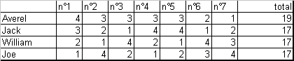 2. On voit ensuite qu'en remplçant dans le tableau n°6, un 4 d'Averell par un 0 et en augmentant de 1 les scores des autres on reste conforme en total et en nombre de victoires (tableau n°2).