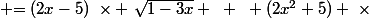 Merci à tous pour vos réponses rapides. J'ai pigé, comme vous dites. En fait, il s'agit de multiplier le numérateur par 2 et la racine d'1-3x, ce qui l'augment au carré, nécessairement. Merci pour la rapidité! Gentil à vous! Et bonne journée. Ps- Monsieur green: j'ai pas vu ces termes au Québec, mais bien essayé! Merci pareil!