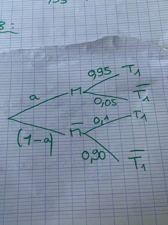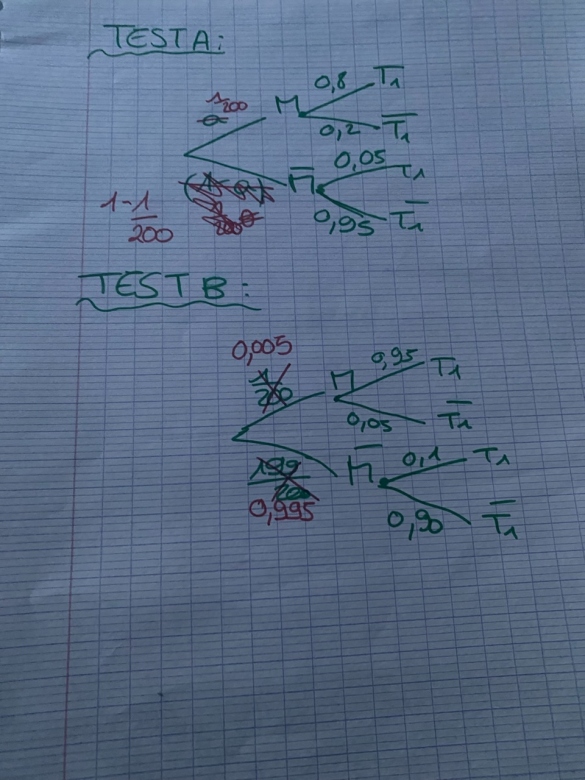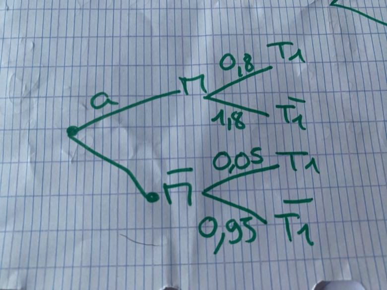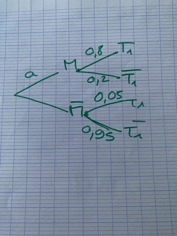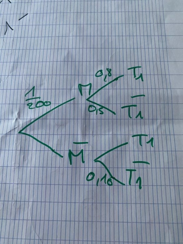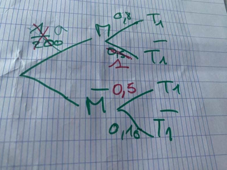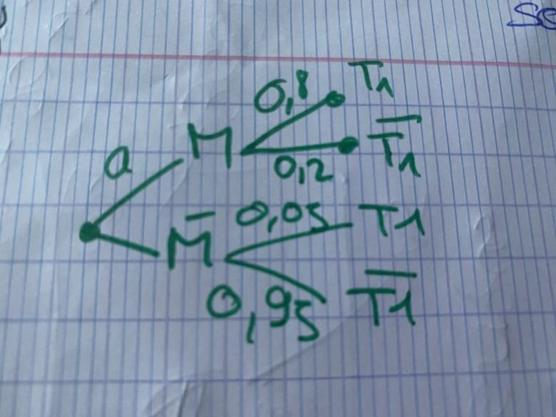 de Mbarre vers T1 : la personne n'est pas malade, et le test A est positif : d'après ton énoncé, quelle est la proba ?